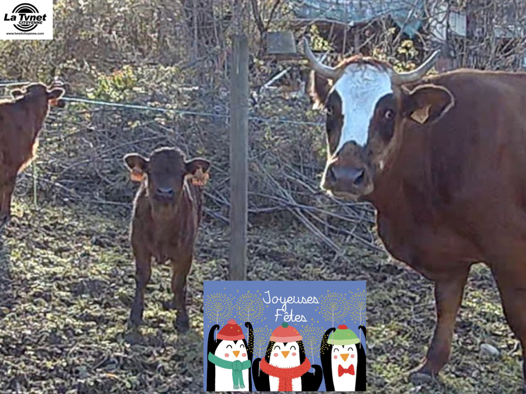 Conte de Noël avec des castors, des lapins, un cheval, une vache et son veau. Joyeuses fêtes