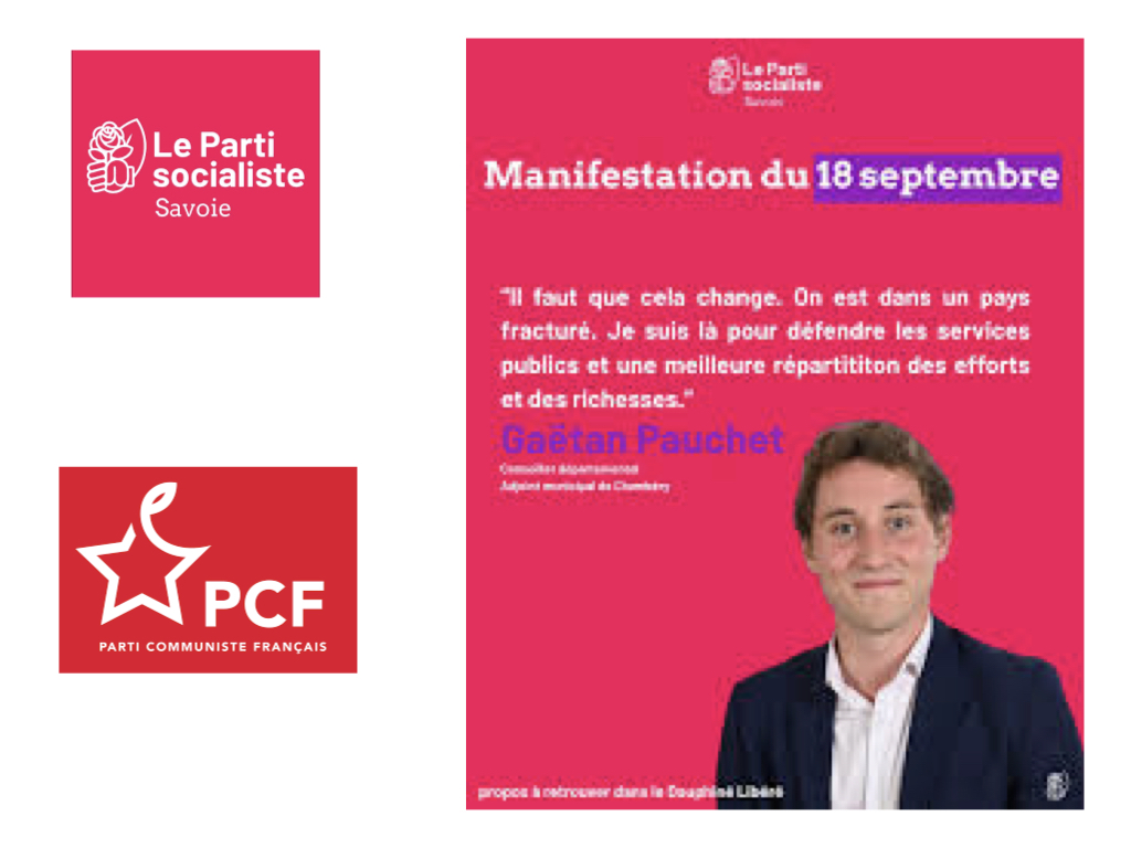 La “Gauche“ est aussi représentée par le PS (Gaëtan Pauchet) qui a à sa remorque le PCF Chambéry (Florian Pennaroyas), et qui va donc constituer sûrement une liste avec les restes de Chambéry en Commun de T.Repentin, et avec ce dernier comme tête de liste ou pas.