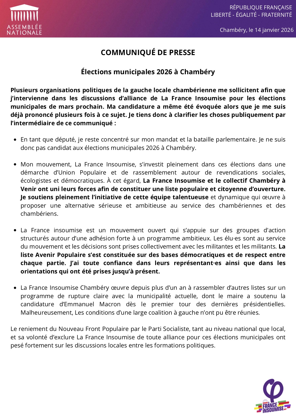 Pas d’explication factuelle de LFI Chambéry à ces anciens partenaires, à nos demandes d’interview et questionnement envoyé, encore moins aux citoyens de gauche de notre ville.